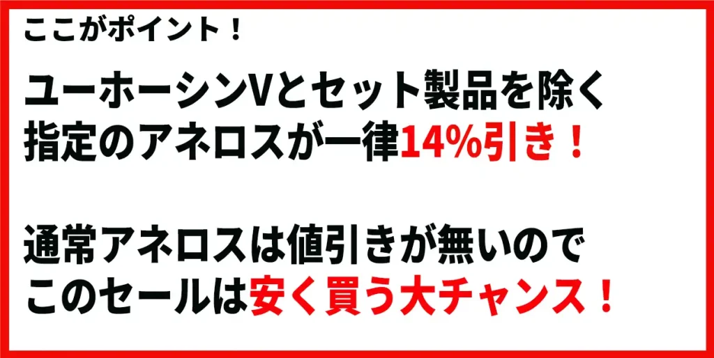 基本値引きの無いアネロスは年に数回セールを行いまいますが「指定アネロス一律14%OFF」のセールは、数少ないアネロスセールの中でもかなりお買い得なセールです。